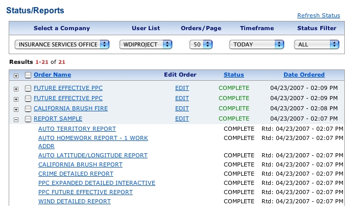 If the Status column lists COMPLETE in red text, the system may not have processed one or more of the reports you ordered. Click the plus symbol (+) at the beginning of the row and then each report listed to see an error message explaining why the report failed.